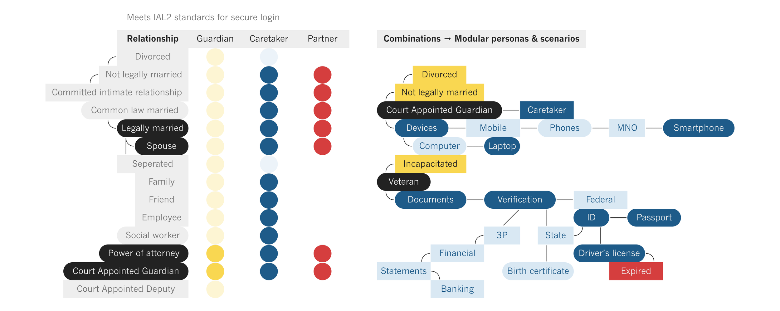 Left: A chart mapping first-degree relationships to veterans across legal and identity dimensions required for IAL2 compliance. Right: A modular persona highlighting the verification barriers these relationships introduce when attempting to act on a veteran’s behalf.